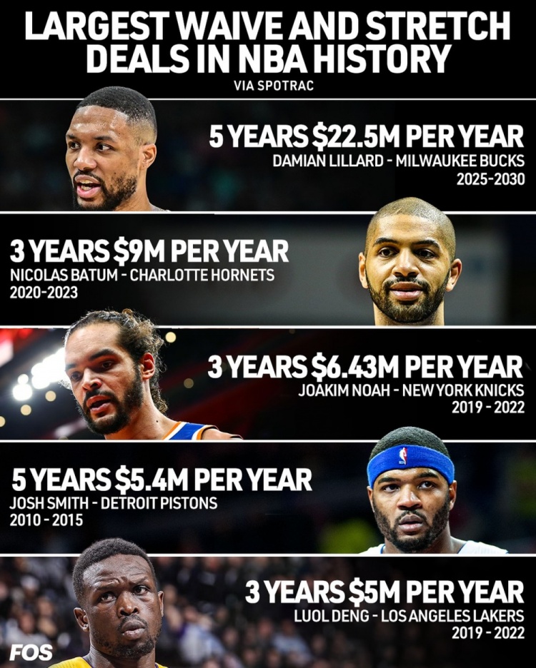 7月3日讯 雄鹿用延伸条款裁掉了利拉德,并将他剩余合同使用延迟支付。接下来五年,雄鹿每年将向利拉德支付2250万美元,这也是NBA历史上最大的一笔裁掉并延迟支付的案例。第二高的是巴图姆,当年黄蜂选择将他2700万美元的剩余合同分3年支付,每年900万美元;第三的则是诺阿,剩余最后一年的合同1930万美元,尼克斯也分3年、每年支付给诺阿643万美元;第四的是“...